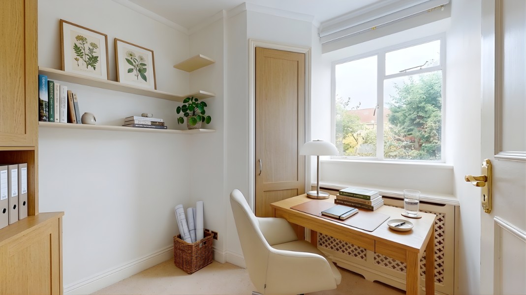 The property offers versatile and well-proportioned accommodation, comprising three bedrooms plus a separate study and a formal dining room. This dining room can easily be used as a substantial fourth double bedroom. The layout further includes two bathrooms, a separate WC, and an expansive living room with direct access to the balcony.